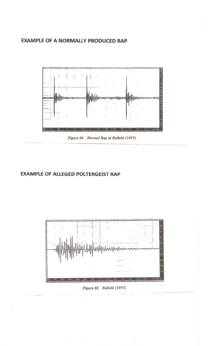 In the case of a normal rap, the sound (which often only lasts a few milliseconds) starts loudly and decays over a period of time. The loudest part of the sound is right at the beginning. In the case of a poltergeist rap, the loudest part is near the beginning of the sound – but not at the very beginning. The rapping sound starts relatively quietly and works up to a maximum before it then starts to decay. This effect has been seen in all ten of the poltergeist cases studied.